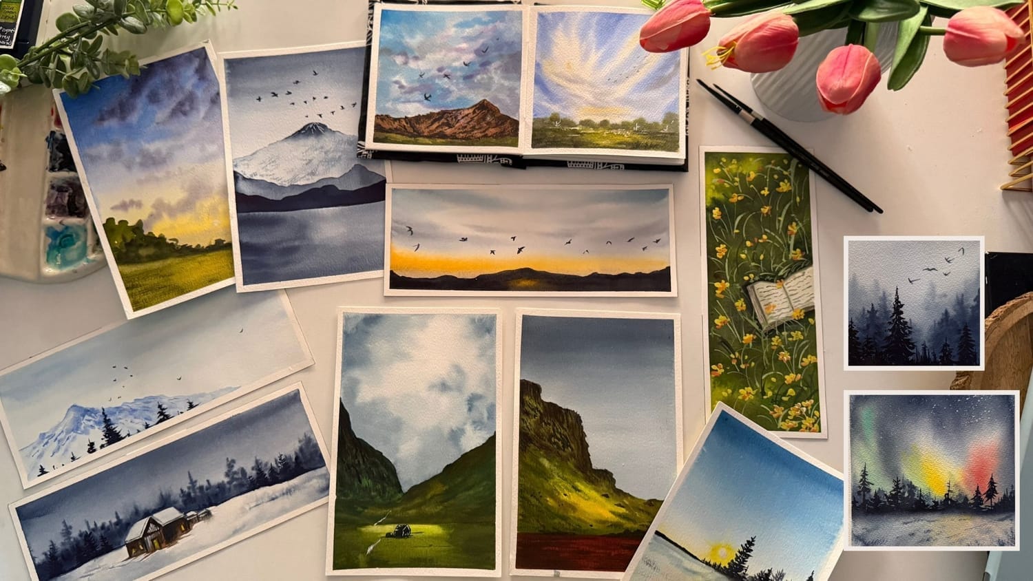 A collection of 7 online Gouache Frame worthy Landscapes + 5 Practice landscapes & a community.